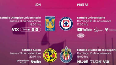 Mientras que en la otra llave, América y Chivas se enfrentarán en la Ida el jueves 13 de noviembre a las 20:07 horas en el Estadio Akron, la Vuelta será el domingo 16 a las 19:00 en el Estadio Ciudad de los Deportes.