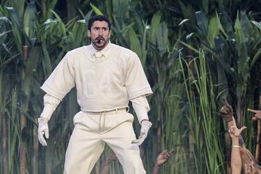 Junto a 茅l, estaba la camiseta con el dorsal 64 que luci贸 durante su actuaci贸n, en un conjunto consist铆a en dos piezas monocrom谩ticas de camisa con cuello y corbata y al estilo de jugador de f煤tbol americano junto con pantalones y zapatillas Adidas.