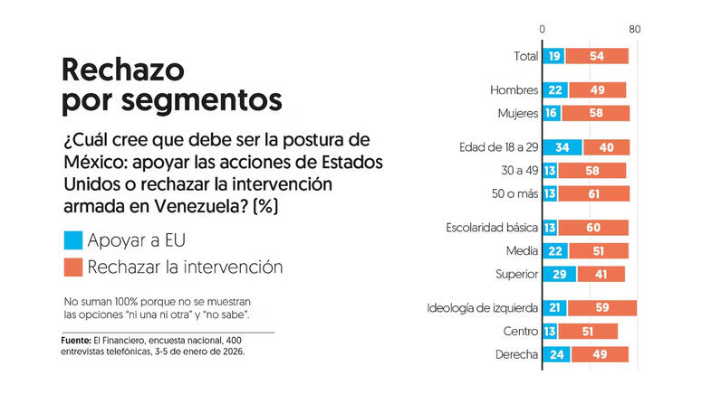 Por lo pronto, la encuesta de EL FINANCIERO sobre las acciones militares en Venezuela, publicada el martes pasado, reveló que la mayoría de la opinión pública mexicana no vio justificación en lo sucedido y expresó un rechazo a la intervención de Estados Unidos en el país sudamericano.