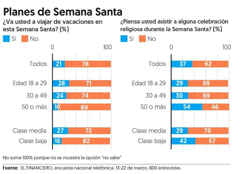Una encuesta nacional de El Financiero revela que este a帽o, durante esta Semana Santa que comienza, 21 por ciento de las y los mexicanos est谩 planeando viajar para tomar unas vacaciones, mientras que 37 por ciento prev茅 asistir a alguna celebraci贸n religiosa.