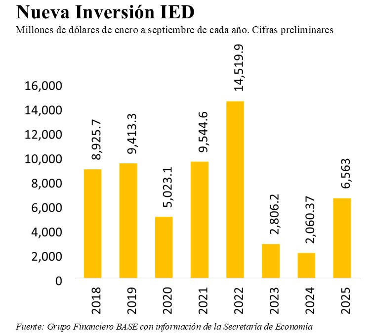 De acuerdo con el comunicado de la Secretar铆a de Econom铆a, entre enero y septiembre del 2025, entraron a M茅xico 40,906 millones de d贸lares de inversi贸n extranjera directa (IED), alcanzando un nuevo m谩ximo hist贸rico para los primeros 9 meses del a帽o y mostrando un crecimiento de 14.46% respecto al mismo periodo del 2024, comparando contra cifras preliminares. Comparando con las series revisadas de los primeros 9 meses del  2024, la IED muestra un crecimiento de 12.21%.