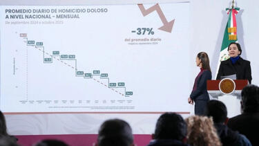 En su intervenci贸n, destac贸 que a nivel nacional el promedio diario de homicidios dolosos disminuy贸 37% en octubre de 2025, en comparaci贸n con septiembre de 2024.