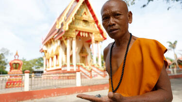 Al otro lado de la divisora, en la provincia tailandesa de Surin, un monje budista sostiene en la palma de su mano un trozo de metralla arrojado por el impacto de un proyectil cerca de un templo.