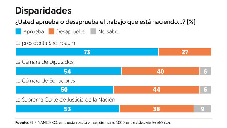 Comparadas con la aprobaci贸n que recibi贸 la presidenta Sheinbaum en el mismo mes, de 73 por ciento, el nivel de apoyo popular a los otros poderes, aunque mayoritario en los casos de los diputados y de la Corte, es evidentemente m谩s bajo, con todo y que la Corte est谩 reci茅n renovada luego de las elecciones judiciales de junio pasado.