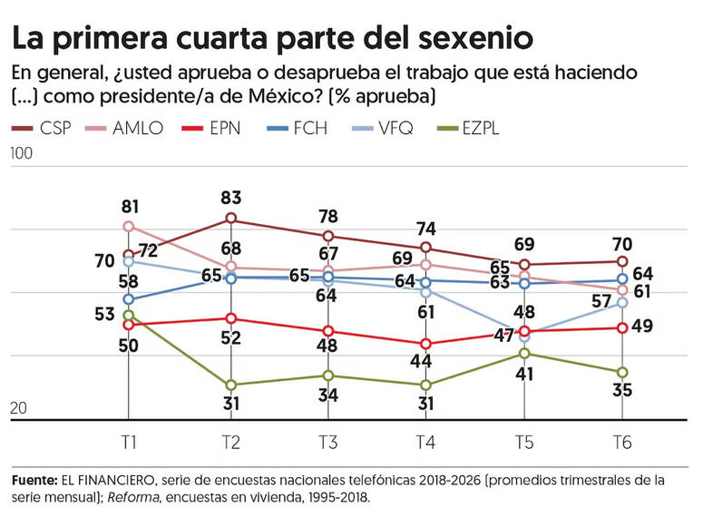 A pesar de mostrar una tendencia a la baja, la aprobaci贸n a Sheinbaum alcanz贸 70 por ciento en enero y febrero de este a帽o, en promedio. A estas alturas de su sexenio, en el sexto trimestre, AMLO ten铆a 61 por ciento; Felipe Calder贸n, 64 por ciento, y Fox, 57 por ciento.