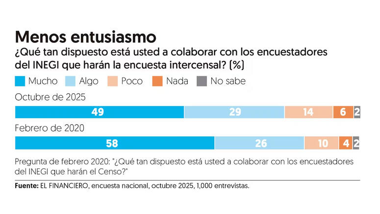 En octubre de 2025, el porcentaje que dijo estar muy dispuesto a colaborar con el INEGI fue casi 10 puntos porcentuales menos: 49 por ciento. Sumado al 29 por ciento que dijo estar algo dispuesto, la disposici贸n a colaborar con el conteo era de 78 por ciento.